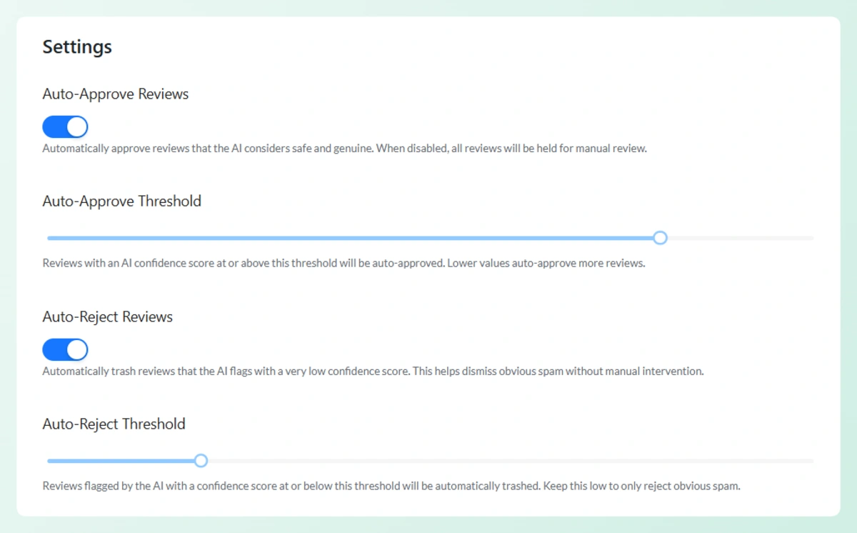 - Auto-Reject Threshold — Sets the confidence score at or below which a review is automatically trashed. Keep this low to only catch the most obvious spam
