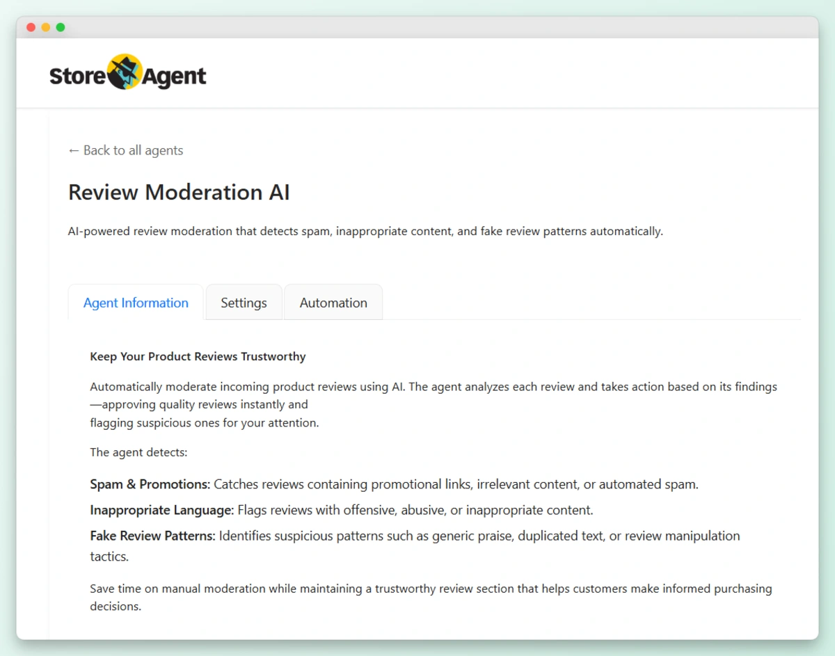 Ready to cut your review moderation workload by 70-80%? AI Product Review Moderation is available on all paid StoreAgent plans. Log into your account and enable it today.