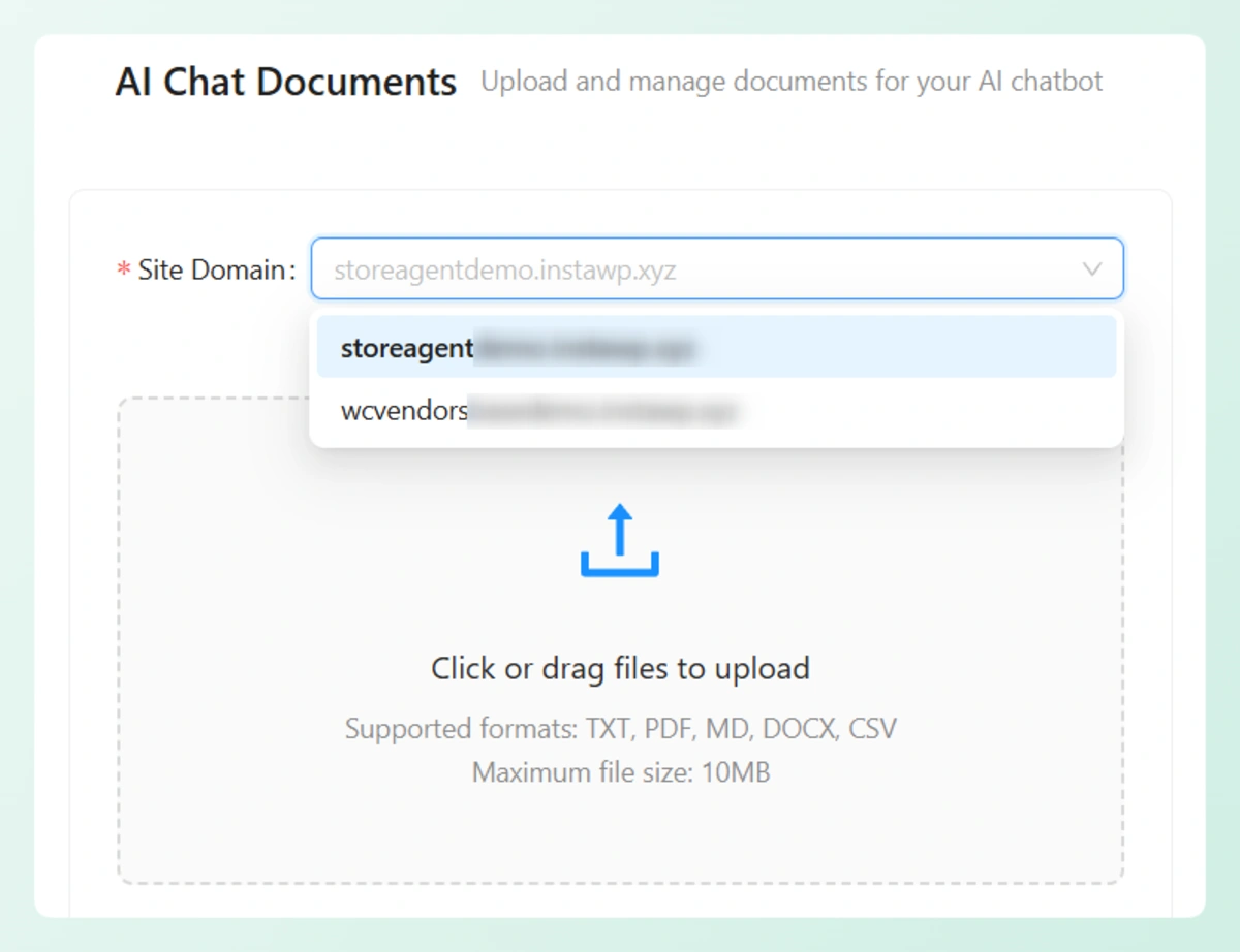 If you manage multiple stores, a domain selector lets you assign documents to a specific site. Each store’s knowledge base stays isolated.
