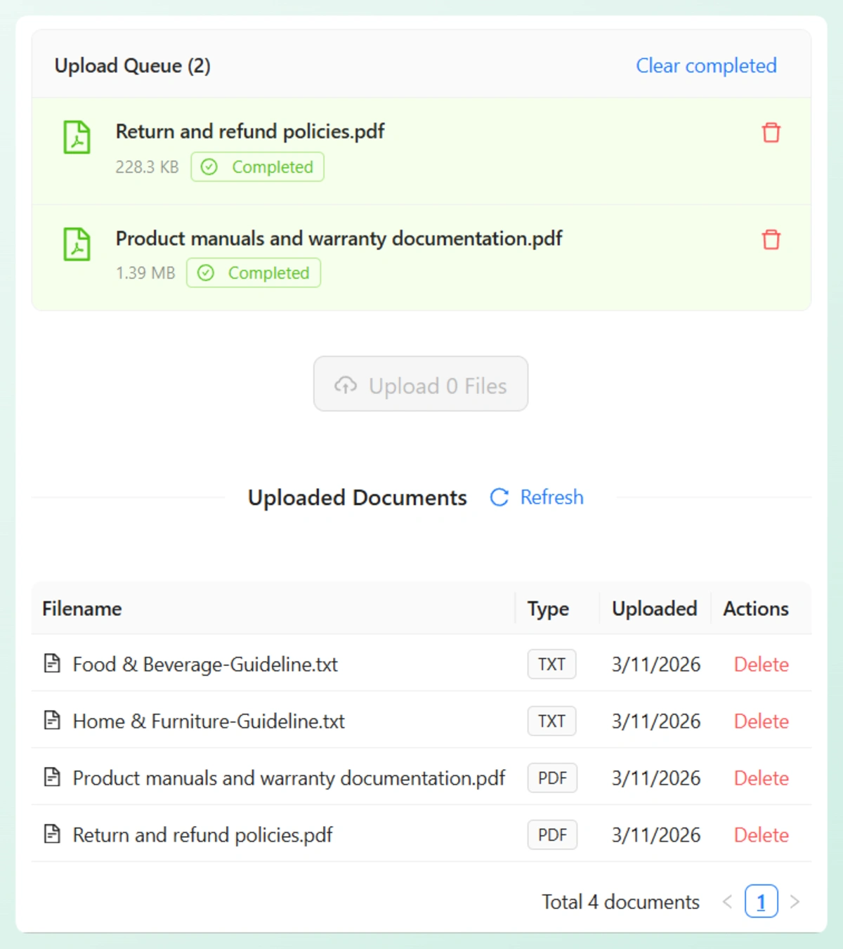 StoreAgent processes and vectorizes uploaded documents automatically. Once processing completes, the content is available to the AI chatbot right away.