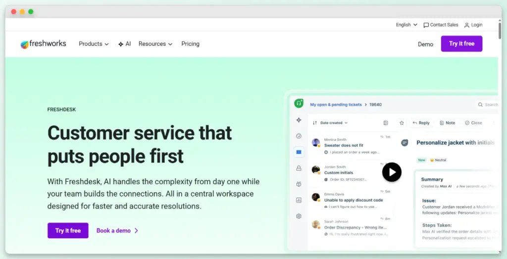 In practice, Freshdesk scales well for teams with multiple agents and complex routing rules. Specifically, Freddy AI can categorize tickets, spot patterns, and suggest replies. For large WooCommerce operations, that depth is hard to match.