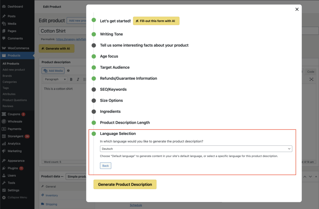 - If you set the general language to Deutsch, all new descriptions generated will be in Deutsch by default.