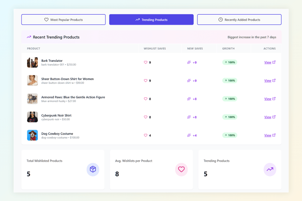 The Advanced Analytics dashboard provides a clear view of trending products and real time growth in wishlist saves