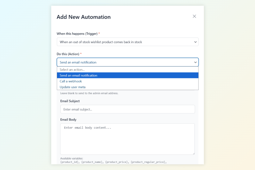 Setting up an automation trigger in SaveTo Wishlist Pro to send email notifications when a product comes back in stock.