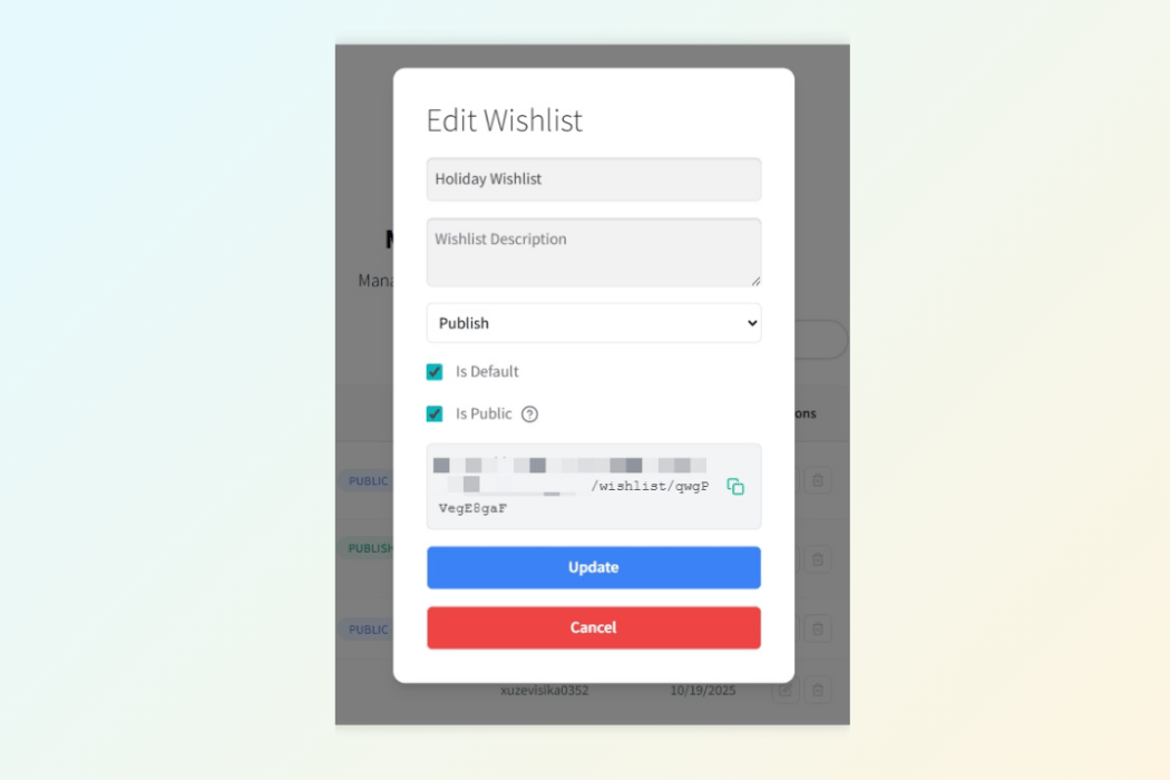 • Public wishlist directory: You can enable a space where shoppers browse public lists. It’s optional, but it helps with product discovery.