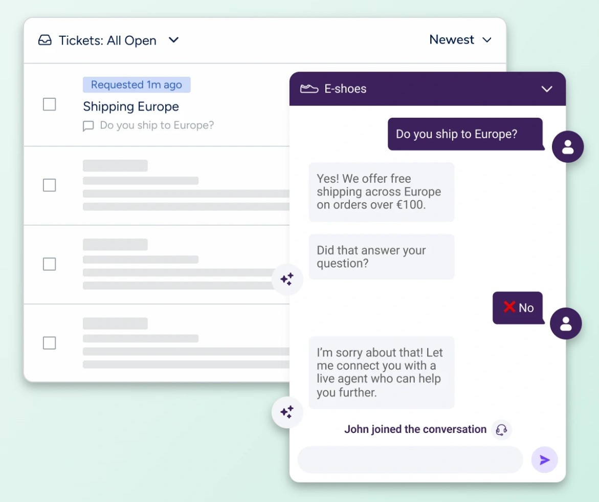 - Escalation by email — sends an AI-written summary to your team when a customer needs human help