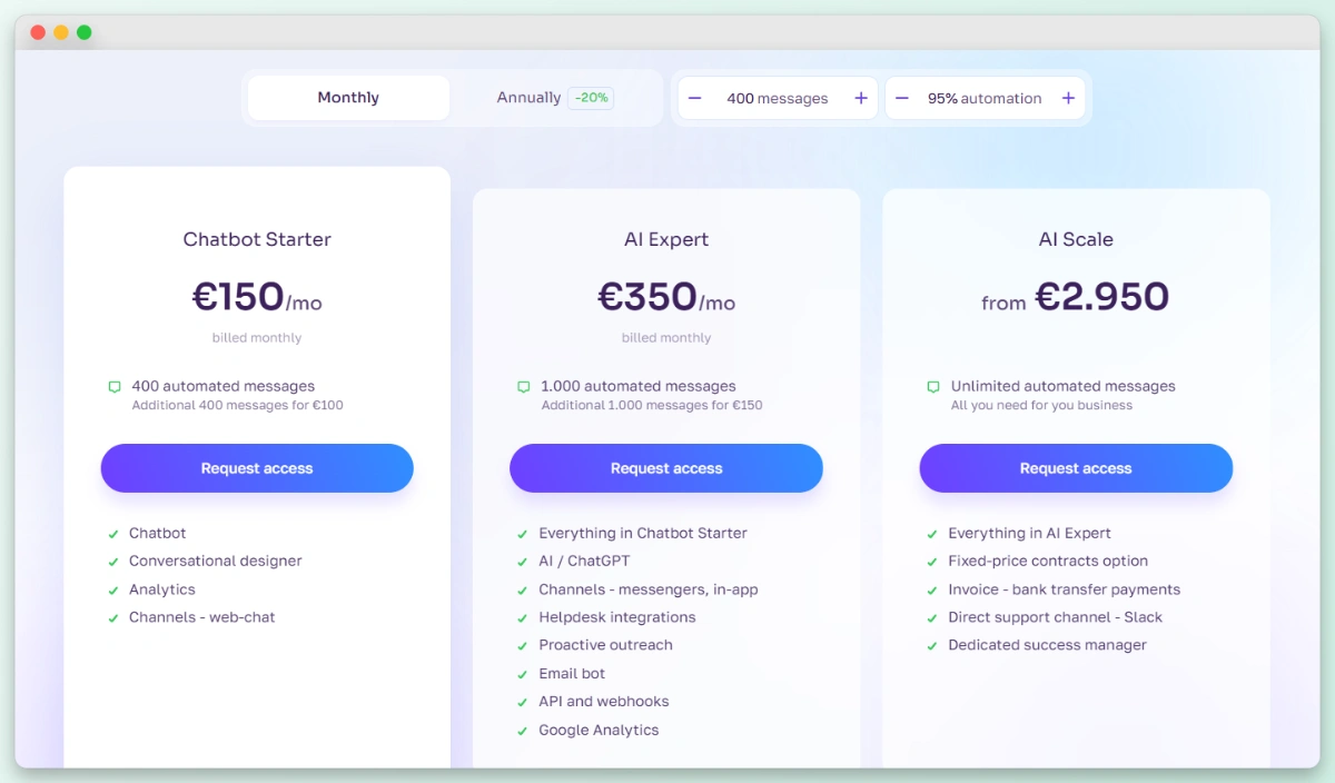 - Amio’s Starter at EUR 150/month has no AI. It uses scripted, rule-based responses only.