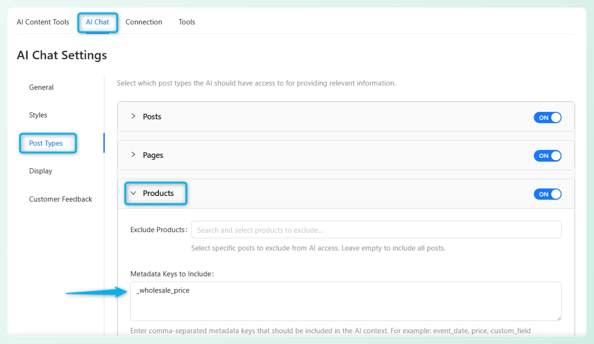 In your WordPress admin, go to StoreAgent > Settings > AI Chat > Post Types, then open the Products section. This is where StoreAgent controls which product data it reads and passes to the AI.