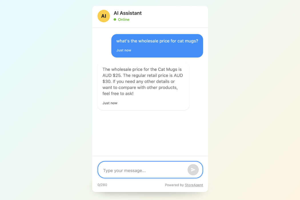 Once you switch that on, StoreAgent includes wholesale-related pricing and metadata from Wholesale Suite inside its AI product context. That means the chatbot has access to wholesale pricing information when responding to product-related questions.