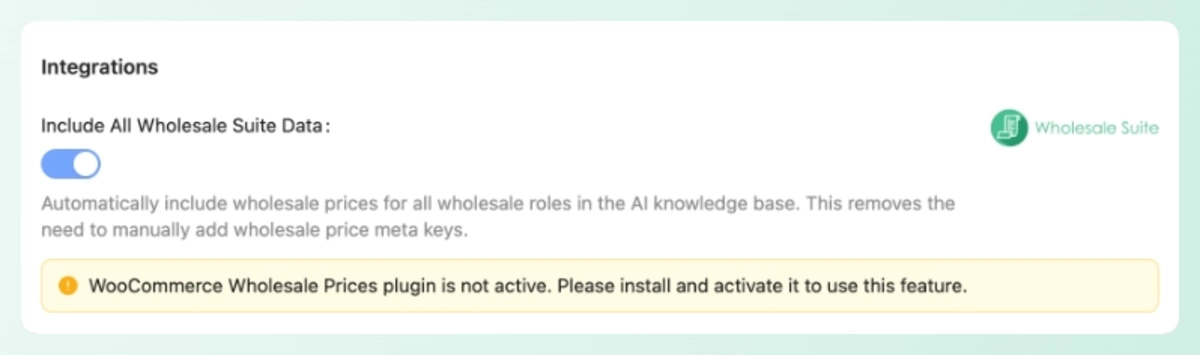 If WooCommerce Wholesale Prices is not active, the setting won’t work and StoreAgent will show a notice telling you to install and activate the plugin first.